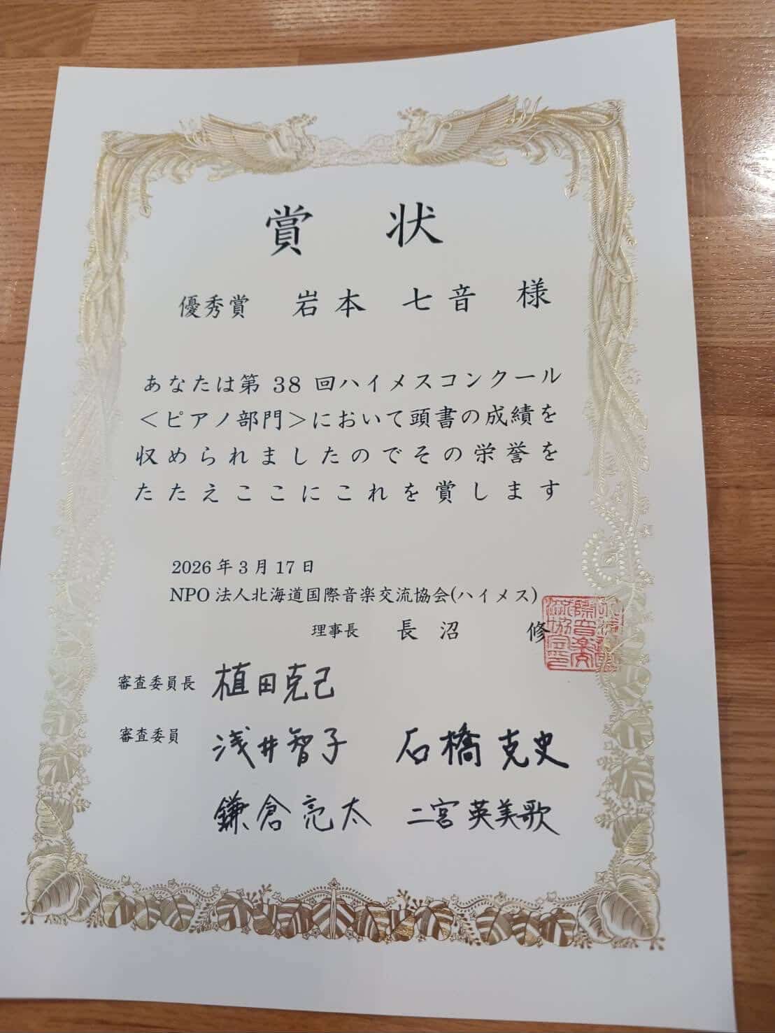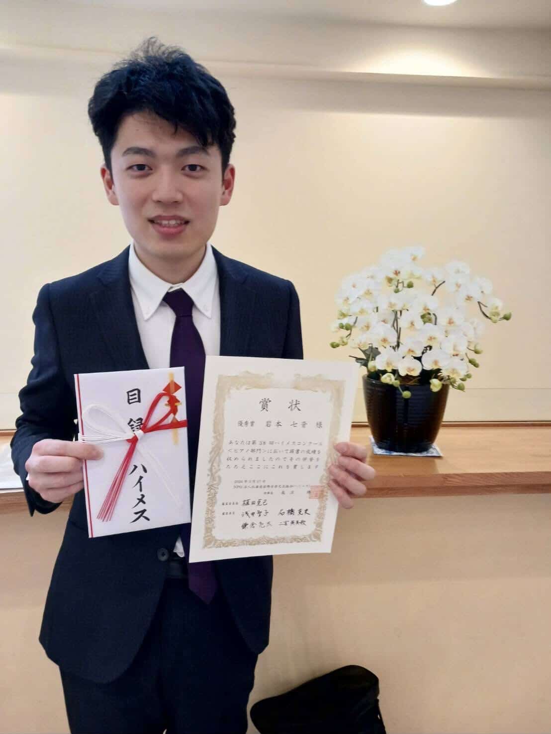 本学商学部商学科3年岩本七音さんが、第38回「ハイメスコンクール<ピアノ部門>」において優秀賞を受賞しました。