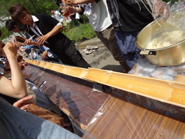 その予行演習も兼ねて、7月3日(火)昼休みに、プレ流しそうめんが行われて、多くの商大生が参加したよ!!