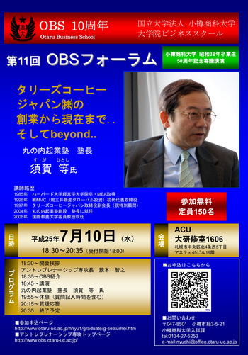 今日は,7月10日(水)に開催されるOBSフォーラムのお知らせだよ。 第11回目となる今回は,丸の内起業塾塾長の須賀 等 氏(すが ひとし)をお迎えし